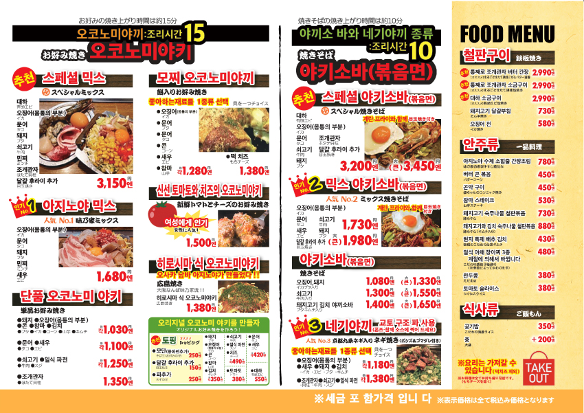 단골 오코노미 야키에서 큰 새우를 사용한 스페셜 오코노미 야키 등이 있습니다.
