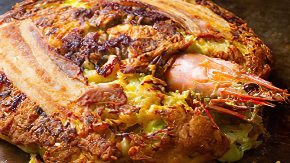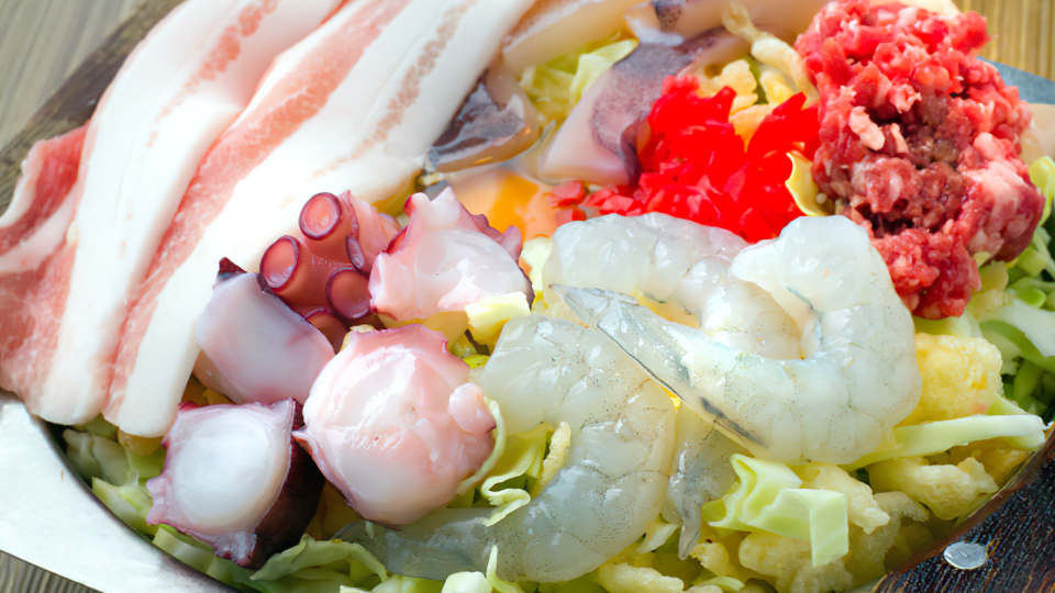 豚肉,ミンチ,イカ,タコ,エビの具材がいっぱい! ボリューム満点のお好み焼きです。